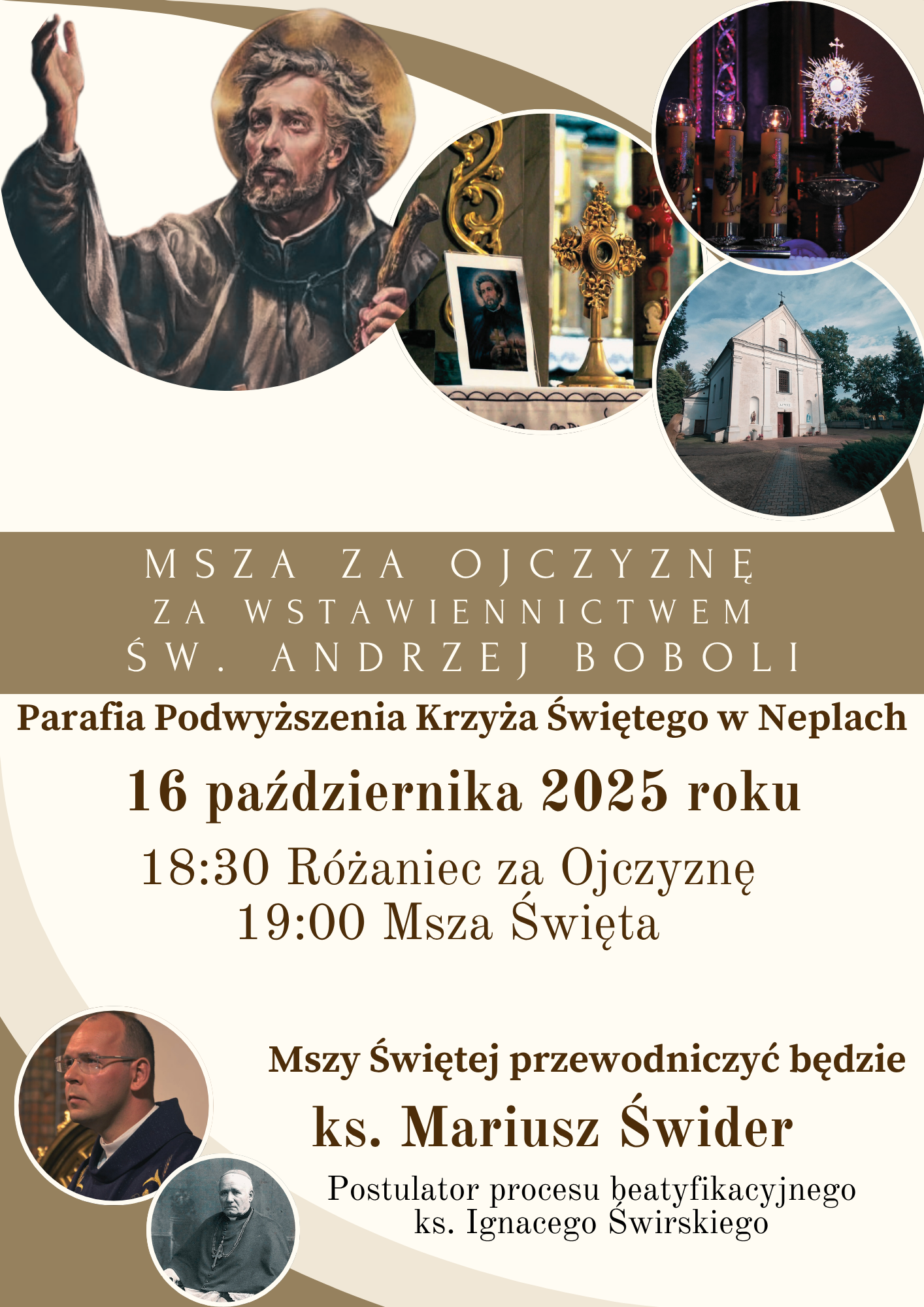 16 października o godz. 19:00 Msza za Ojczyznę przez wstawiennictwo św. Andrzeja Boboli, różaniec o godz. 18:30. Będziemy gościć ks. Mariusza Świdra, postulatora procesu beatyfikacyjnego Sługi Bożego ks. Bp Ignacego Świrskiego.