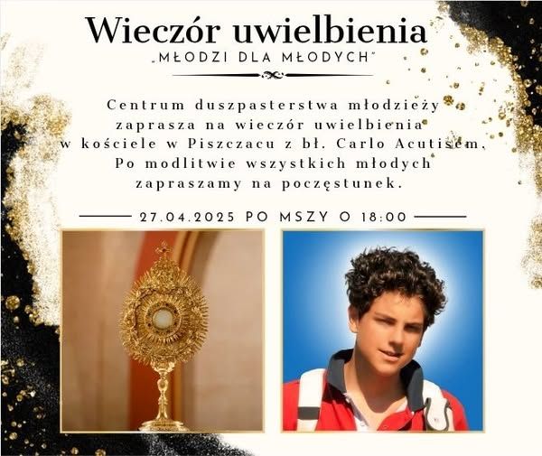Wieczór uwielbienia odbędzie się w niedzielę, 27.04.2025 r. Zapraszamy na Mszę o godz. 18:00, po której odbędzie się adoracja Najświętszego Sakramentu i modlitewne czuwanie pod hasłem „Młodzi dla młodych”. Młodzi z Centrum Duszpasterstwa Młodzieży w Siedlcach poprowadzą modlitwy uwielbienia oraz przywiozą ze sobą relikwie bł. Carla Acutisa i powiedzą nam kim był ten niesamowity młodzieniec, który zmarł w 2006 r. mając zaledwie 15 lat, a już w niedzielę 27 kwietnia zostanie ogłoszony świętym.