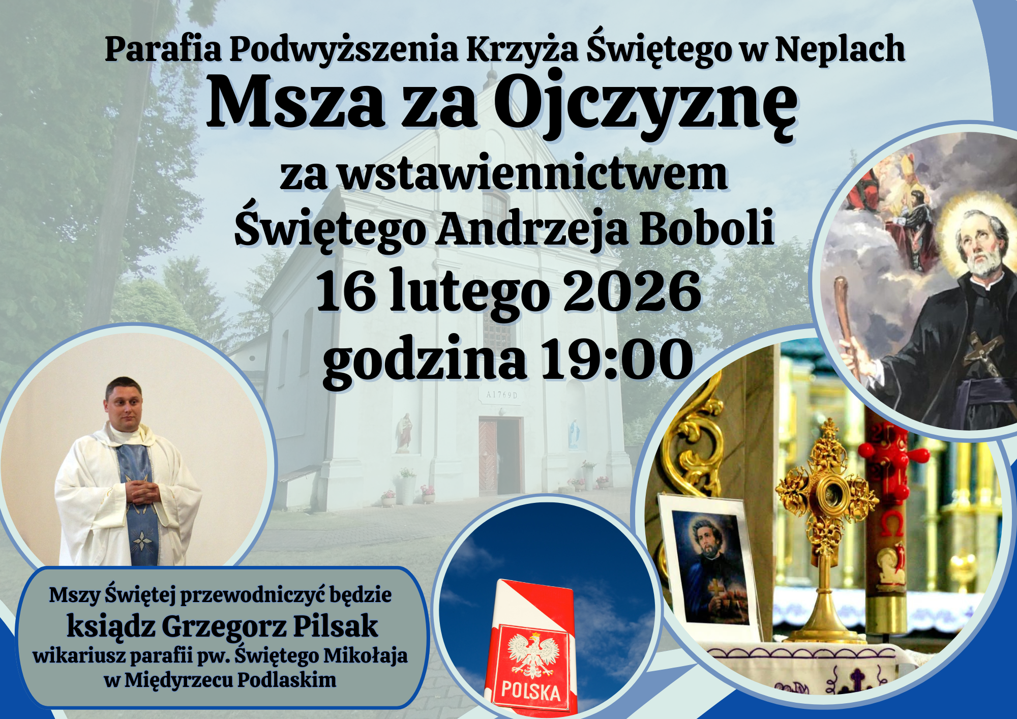 Już 16 lutego (poniedziałek) o godz. 19:00 w kościele w Neplach kolejna Msza Święta za Ojczyznę przez wstawiennictwo św. Andrzeja Boboli. Naszej modlitwie będzie przewodniczył i słowo wygłosi ks. Grzegorz Pilsak - wikariusz par. św. Mikołaja w Międzyrzecu Podlaskim.