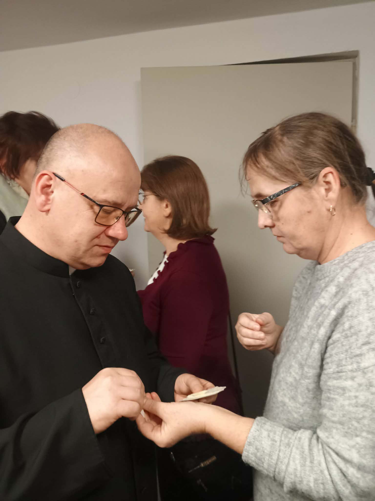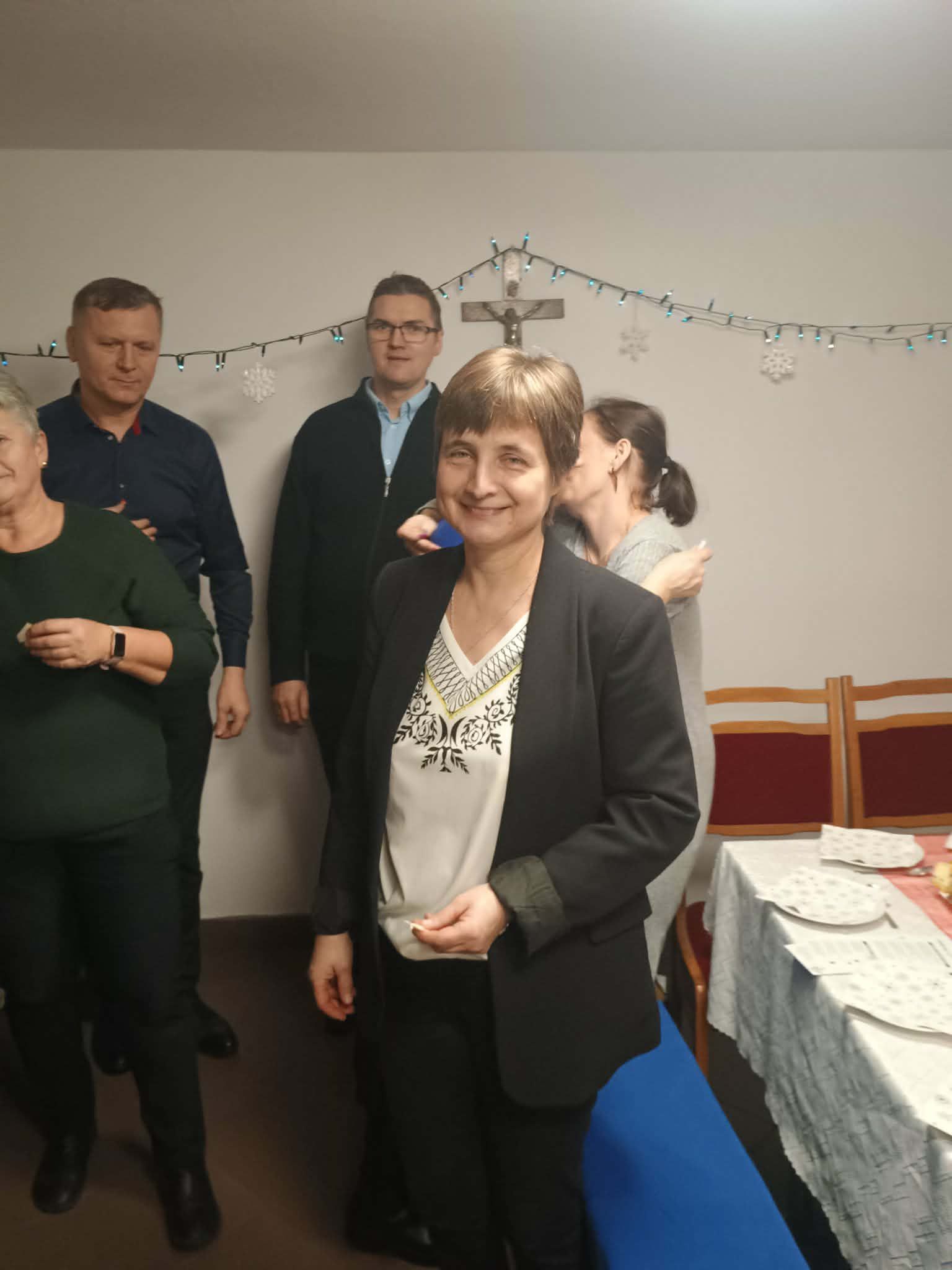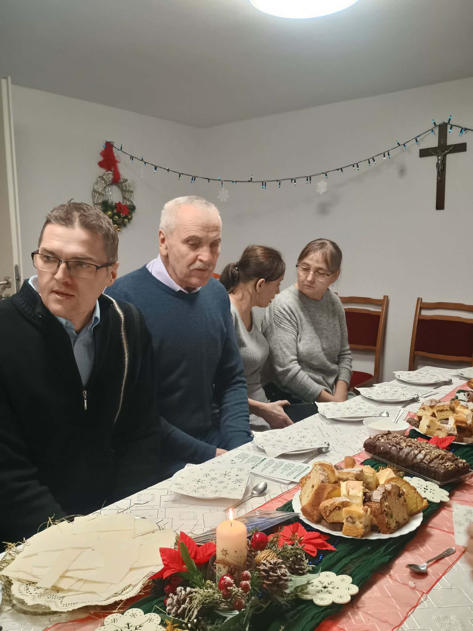 Kolejnym punktem była modlitwa ks. Proboszcza i dzielenie się opłatkiem. Składaliśmy sobie nawzajem życzenia Bożego błogosławieństwa i opieki Matki Bożej na Nowy Rok, po czym zasiedliśmy do stołu. Kosztując przyniesione przez uczestników ciasto, popijając kawą lub herbatą śpiewaliśmy kolędy.