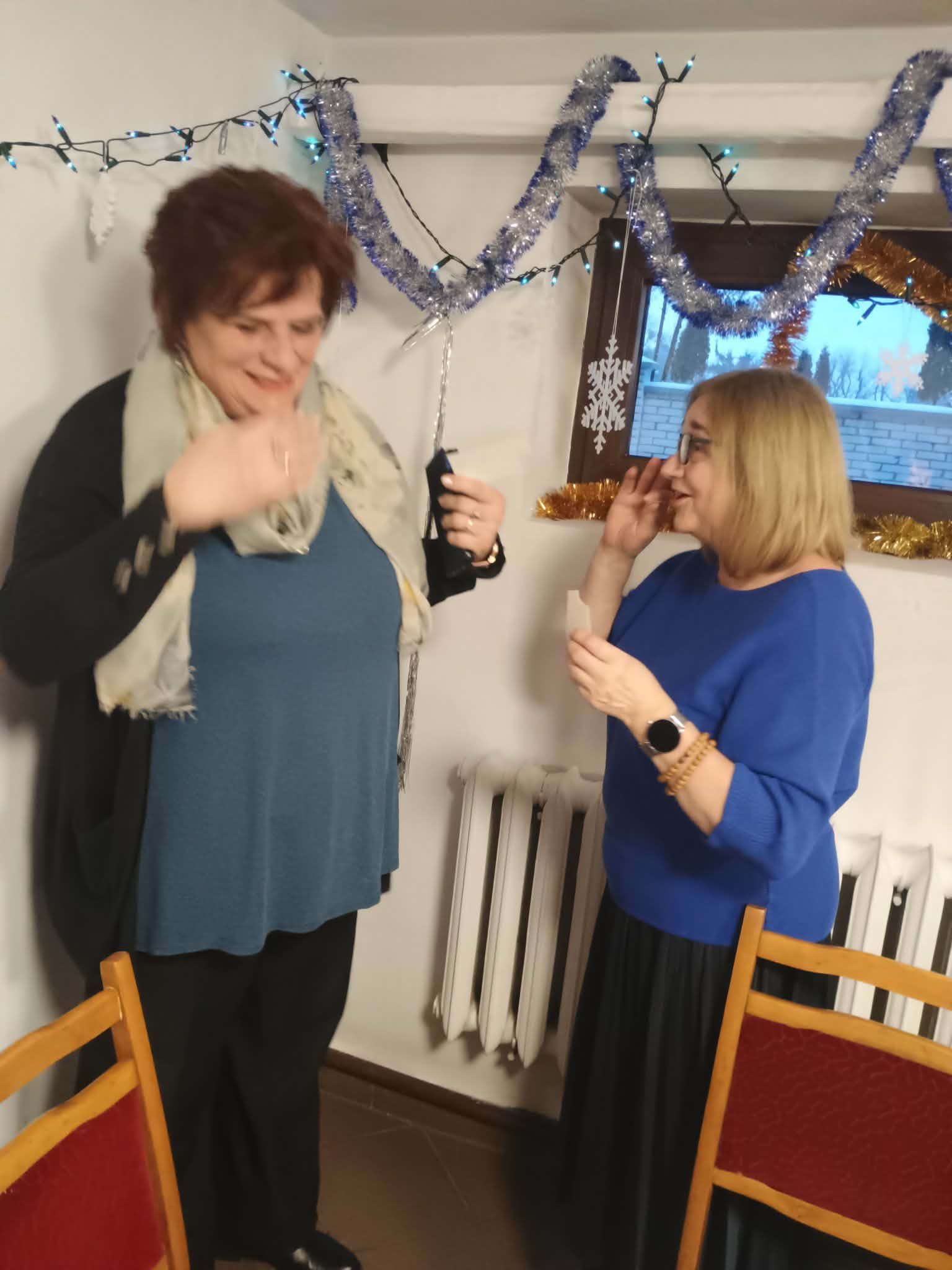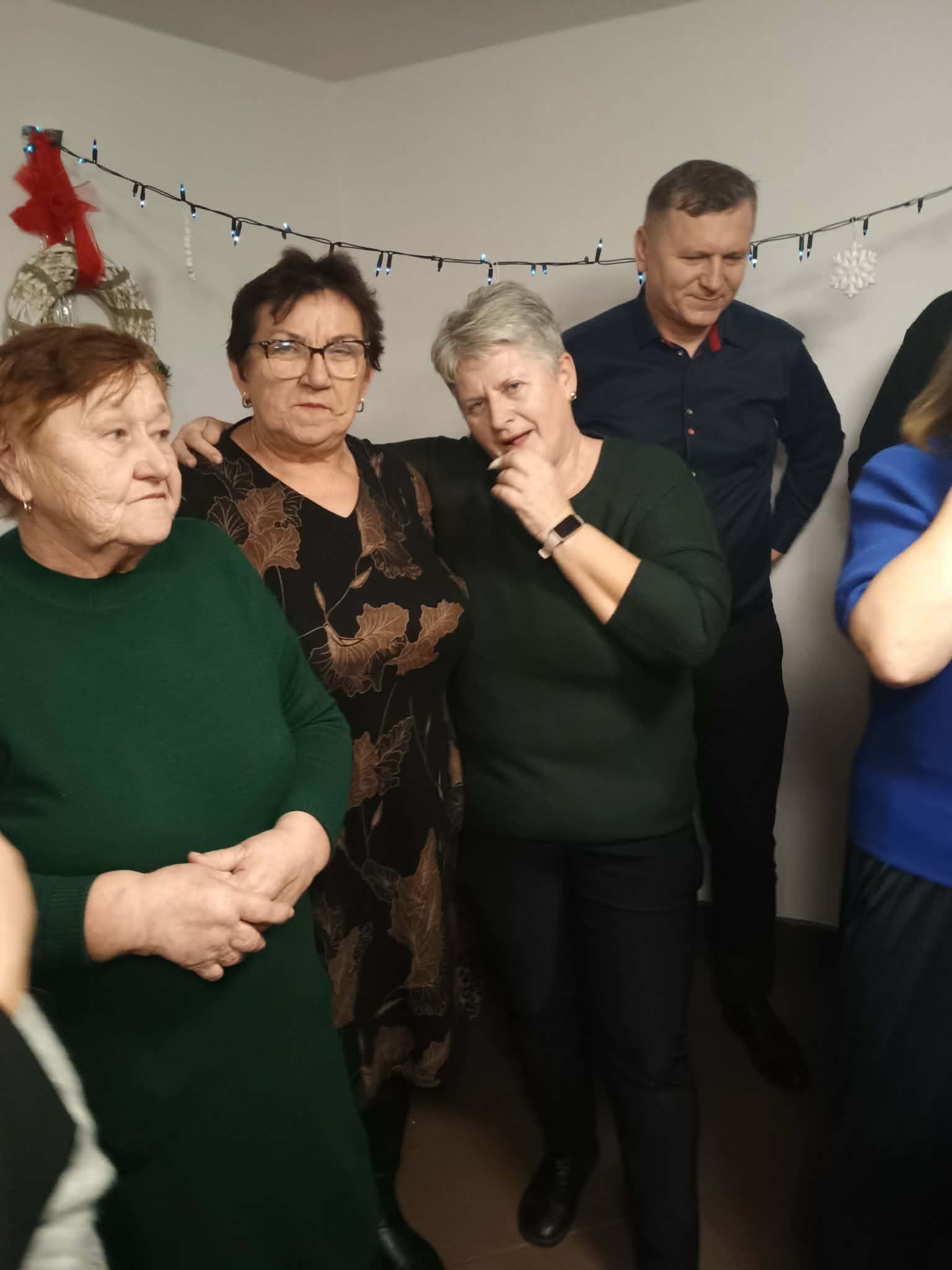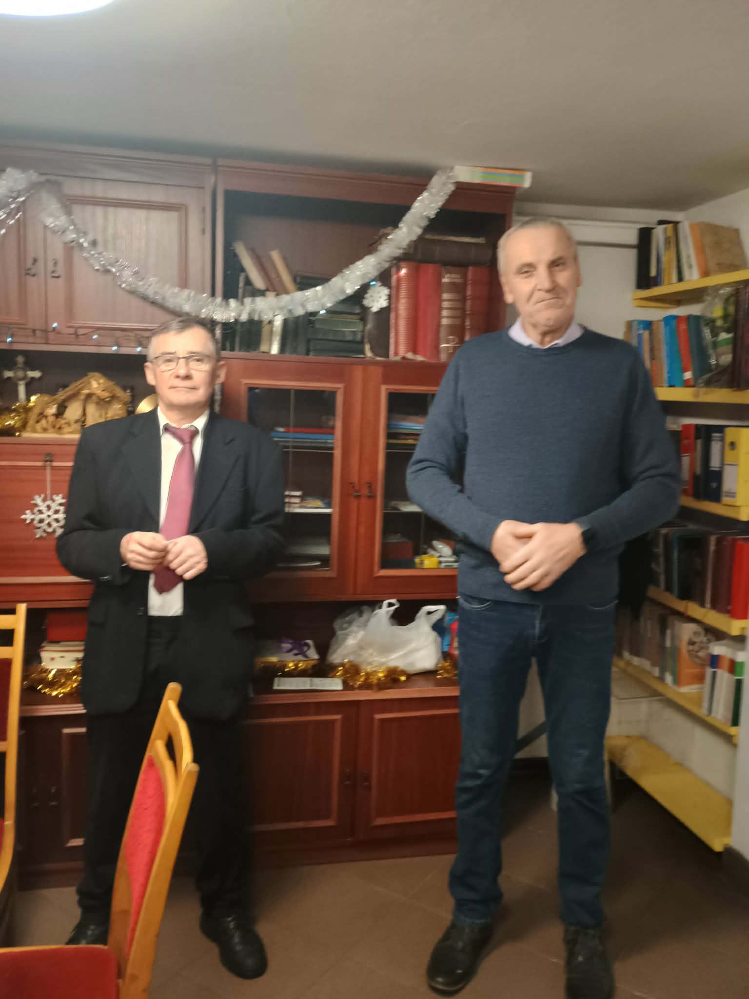 Kolejnym punktem była modlitwa ks. Proboszcza i dzielenie się opłatkiem. Składaliśmy sobie nawzajem życzenia Bożego błogosławieństwa i opieki Matki Bożej na Nowy Rok, po czym zasiedliśmy do stołu. Kosztując przyniesione przez uczestników ciasto, popijając kawą lub herbatą śpiewaliśmy kolędy.